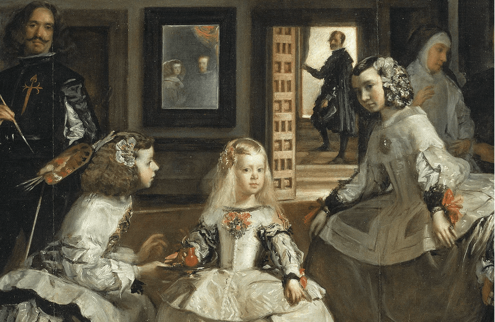 In this detail of Diego Velázquez’s Las Meninas, do we watch the artist paint the king and queen reflected in the mirror behind him? Or, are we, the viewer, the king or queen getting their likeness painted? Or, is it the portrait being painted that is reflected in the mirror? The answer requires reflection on a reflection.